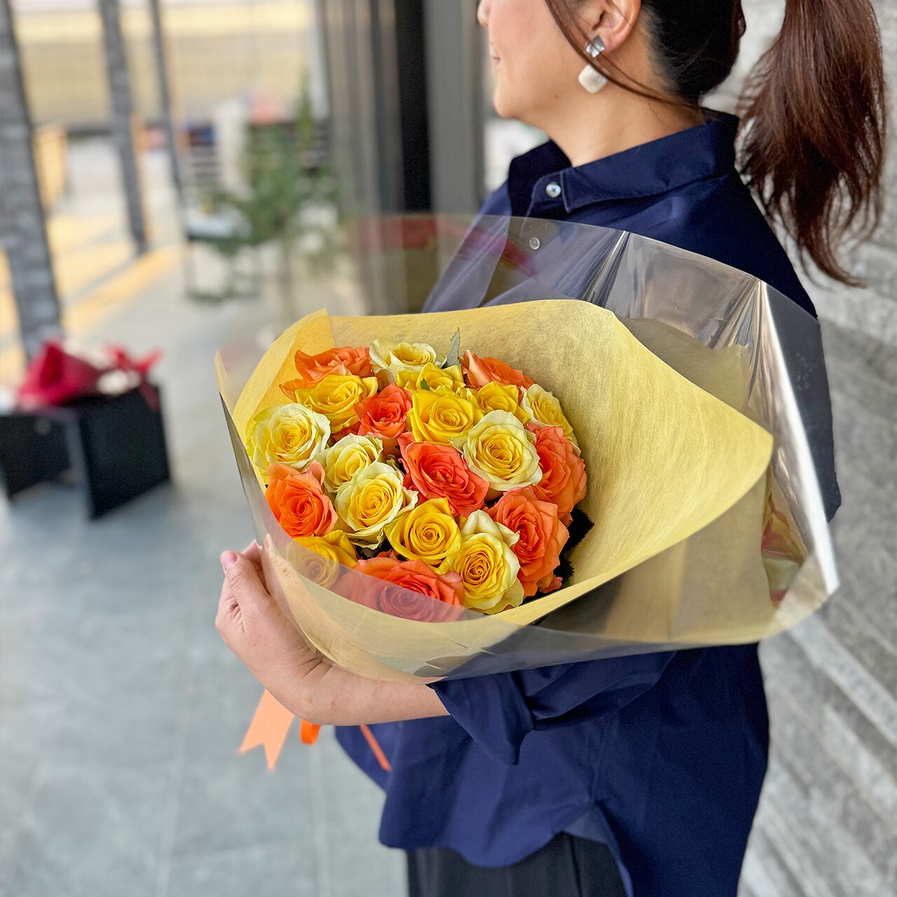 こちらは黄色・オレンジ色メインのバラの花束です