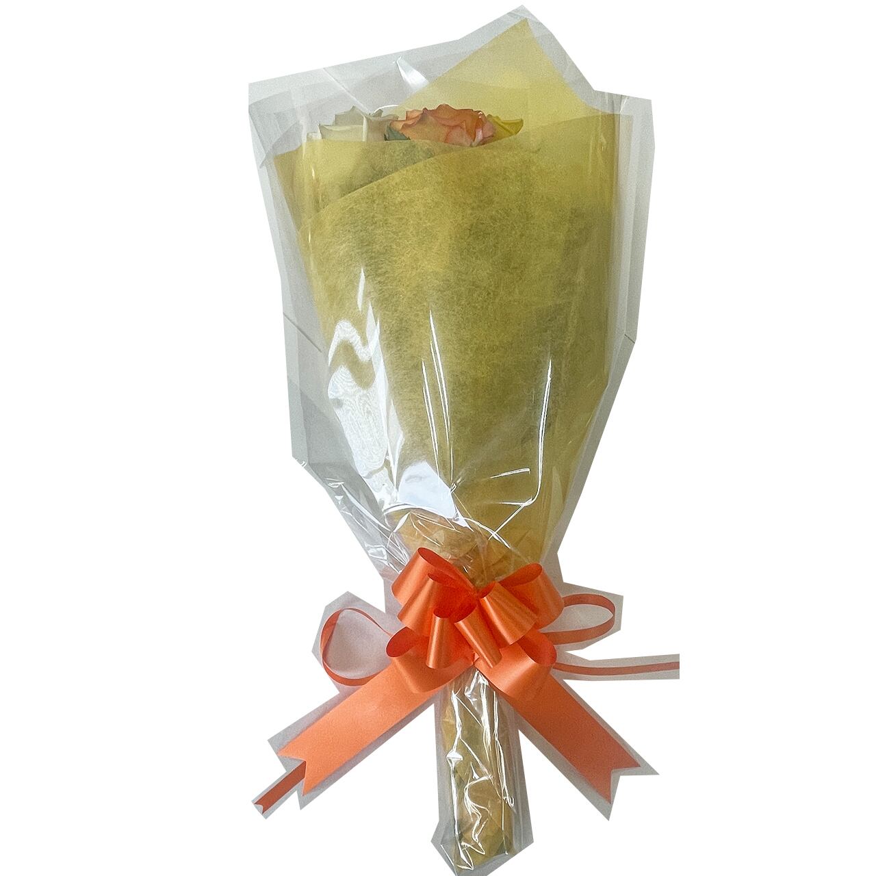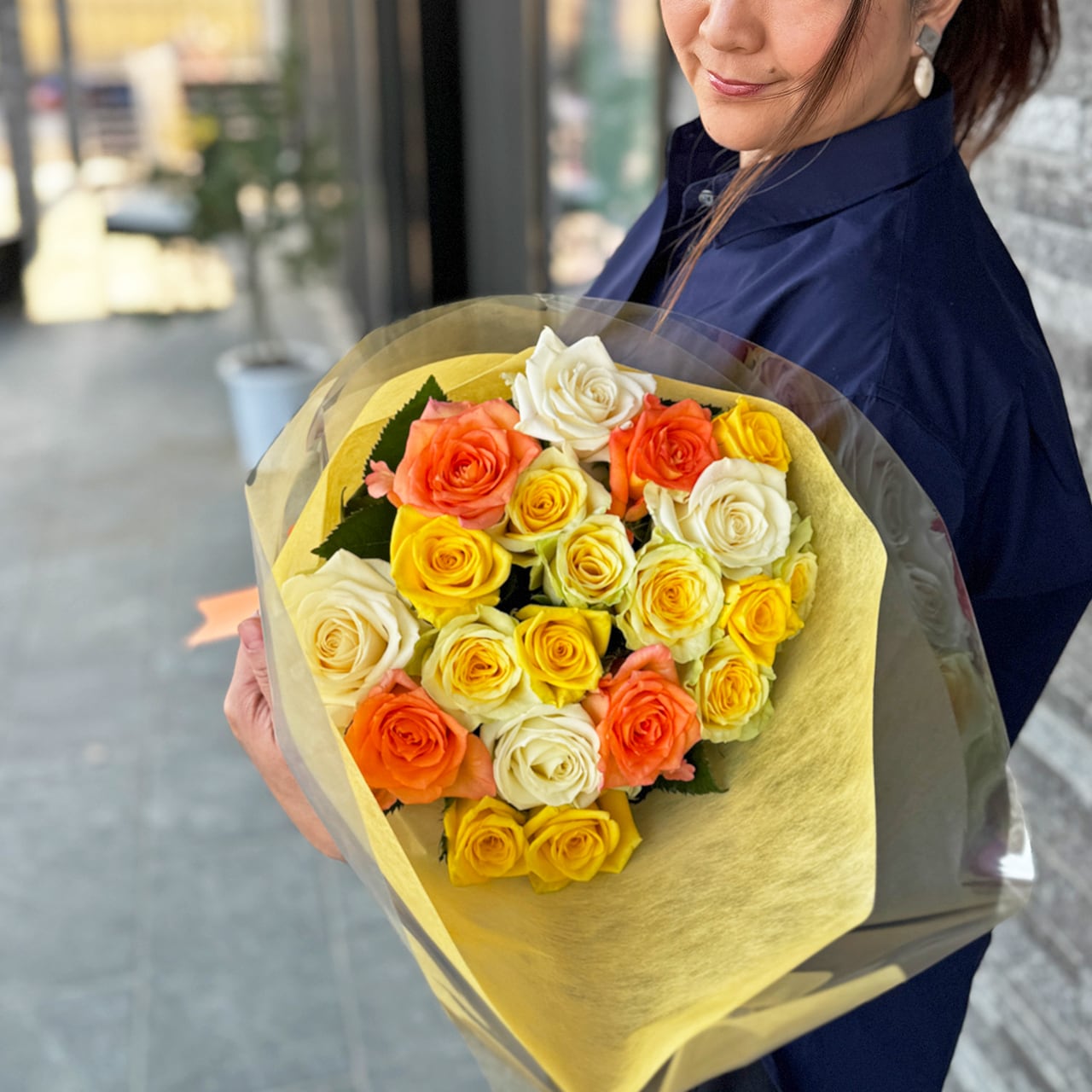 こちらは黄色・オレンジ色メインのバラの花束です
